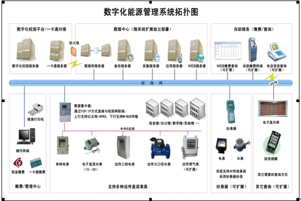 Our company has proposed a system solution integrating software and hardware from multiple aspects such as technological advancement, product stability and reliability, system economy, platform applicability, etc. It not only has a variety of metering instruments such as water, electricity, gas, and heat developed independently, but also has independently developed data concentrators and digital energy management system software for universities, as shown in the following figure: