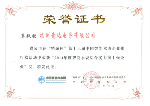 經(jīng)過三個月的網(wǎng)上公投及專家評審,第十三屆中國智能水表企業(yè)排行榜揭曉,我司榮獲“2014年度智能水表綜合實力前十強”企業(yè)稱號!從2005年至今,我司連續(xù)10年被評定為智能水表行業(yè)綜合實力前十強企業(yè),充分體現(xiàn)了用戶對我司的價值肯定!我司將一如既往地服務(wù)于供水企業(yè)、水資源管理部門、自來水公司,不斷創(chuàng)新穩(wěn)步發(fā)展,合作共贏,為客戶創(chuàng)造價值!