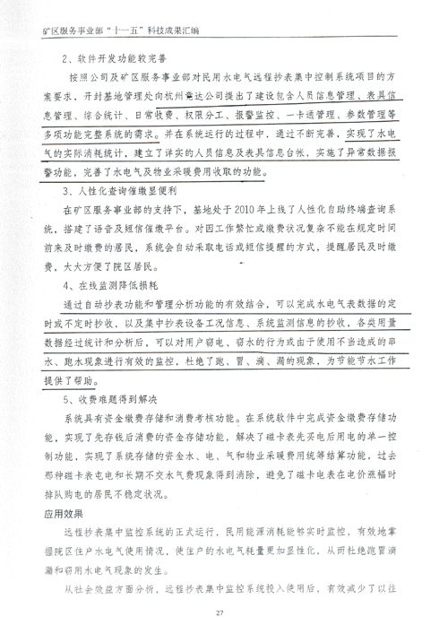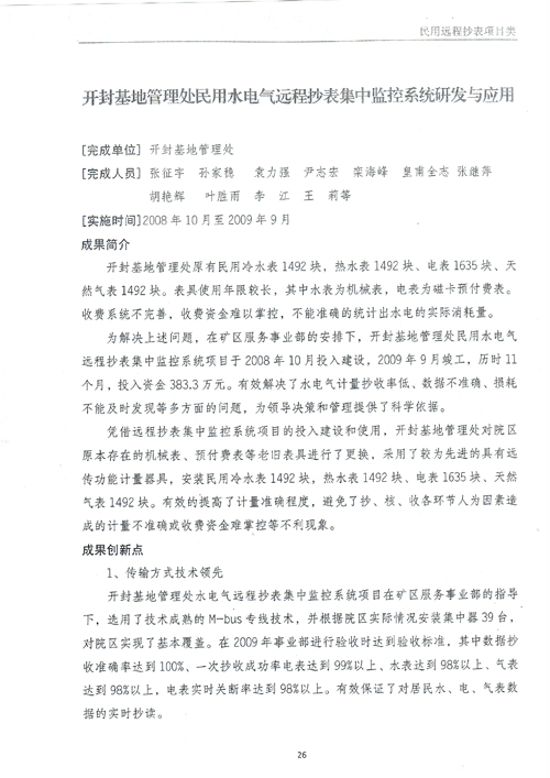 “開封基地民用水電氣遠(yuǎn)程抄表系統(tǒng)”包含由本司生產(chǎn)的電子式遠(yuǎn)傳冷水表1492塊、電子式遠(yuǎn)傳熱水表1492塊、電子式遠(yuǎn)傳電表1635塊、遠(yuǎn)傳智能燃?xì)獗?/span>1492塊、數(shù)據(jù)集中器39臺以及遠(yuǎn)程集抄系統(tǒng)軟件,2008年10月開始建設(shè),2009年9月竣工。驗(yàn)收報告顯示,數(shù)據(jù)抄收正確率達(dá)到100%;一次抄收成功率電表達(dá)到99%以上、水表達(dá)到98%以上、氣表達(dá)到98%以上,電表實(shí)時關(guān)斷率達(dá)到98%以上。有效保證了對居民水、電、氣表的實(shí)時抄讀。本項(xiàng)目的實(shí)施同樣獲得了用戶高度好評。
