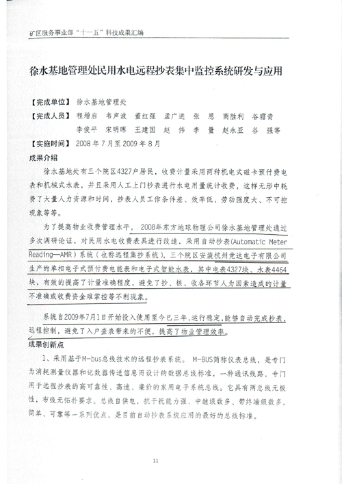 近日,“東方地球物理公司礦區(qū)服務(wù)事業(yè)部”出版了“十一五”期間“科技成果匯編”,詳細(xì)羅列了“十一五”期間礦區(qū)各單位取得的50余項(xiàng)優(yōu)秀科技成果,其中由杭州競達(dá)電子有限公司實(shí)施的“徐水基地”和“開封基地”遠(yuǎn)程集抄系統(tǒng)(簡稱AMR系統(tǒng)),被列入“優(yōu)秀科技項(xiàng)目”。