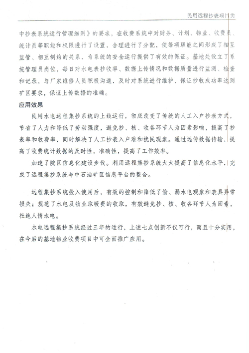 “徐水基地民用水電遠(yuǎn)程抄表系統(tǒng)”包含由本司生產(chǎn)的單相電子式預(yù)付費(fèi)電能表4327塊、電子式智能水表4464塊、幾十個數(shù)據(jù)集中器以及遠(yuǎn)程集抄系統(tǒng)軟件,從2009年7月1日投入使用至今,運(yùn)行穩(wěn)定,抄表正確率達(dá)到99%以上,有效提高了計量準(zhǔn)確度,避免了抄、核、收各環(huán)節(jié)人為因素造成的計量不準(zhǔn)確或收費(fèi)資金難掌握等不利現(xiàn)象,同時避免了入戶查表帶來的不便,提高了物業(yè)管理效率。本項(xiàng)目的實(shí)施獲得了用戶的高度好評。